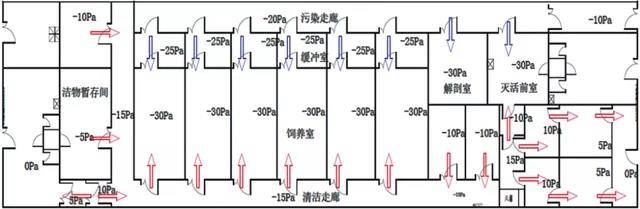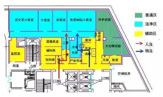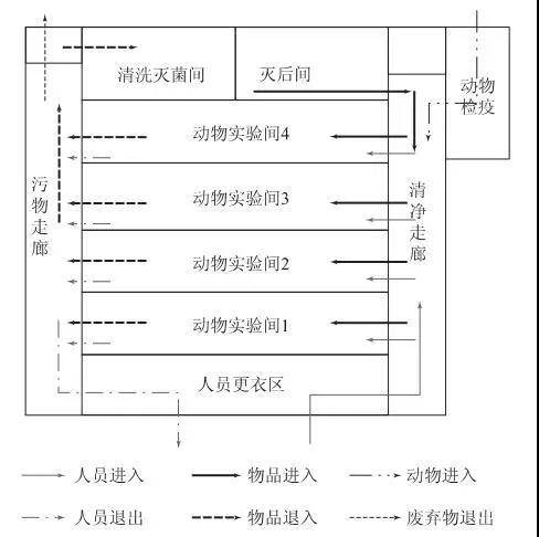 实验室动物房的工艺设计流向包括:实验人员、饲养人员和检疫人员的进入和退出路线;动物的进入和退出路线,解剖和废弃尸体的流向;动物用垫料和饲料的进出流向;笼器具进出流向;样品进出流向等。各种流向需要合理分流,避免交叉污染。